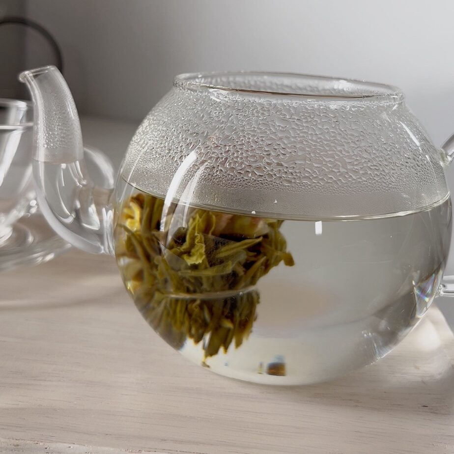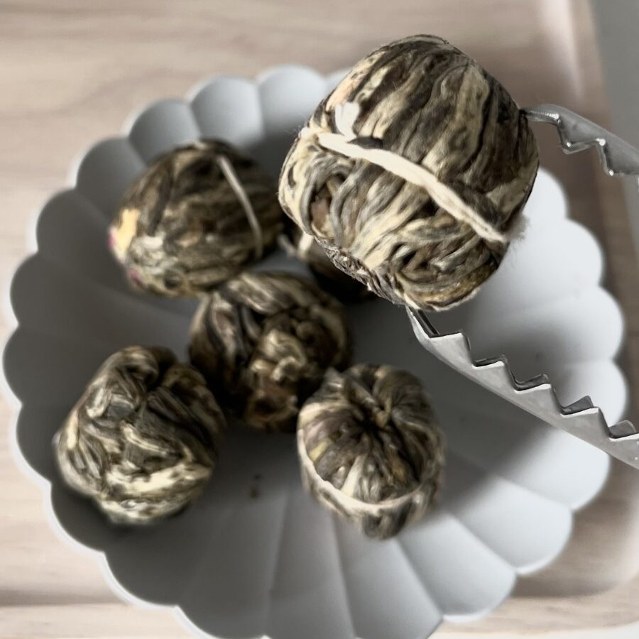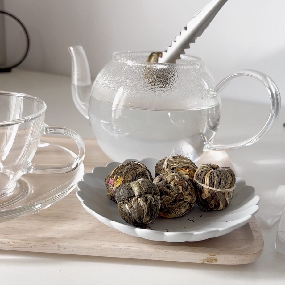丸いこの茶葉をポットに入れて、お湯を注ぐとゆっくりと葉が開くて、まるで花が咲くように目でも楽しめるお茶だよ♡