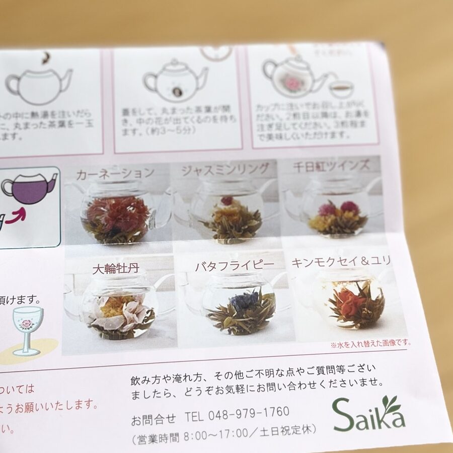 飲んだ後、茶葉は水を入れ替えて水中花としても楽しめるよ!